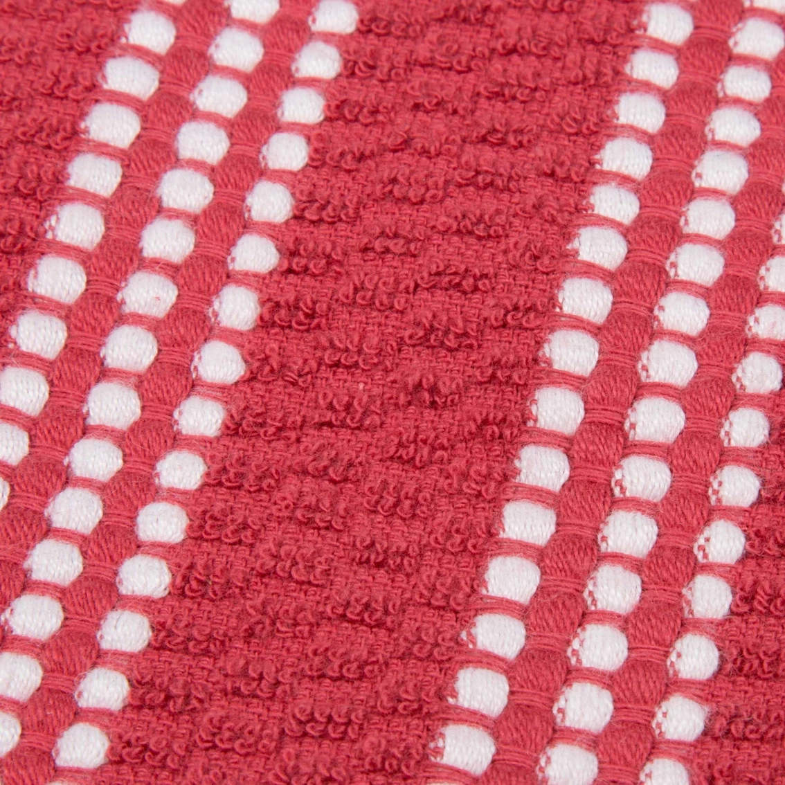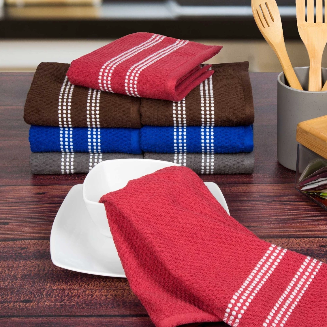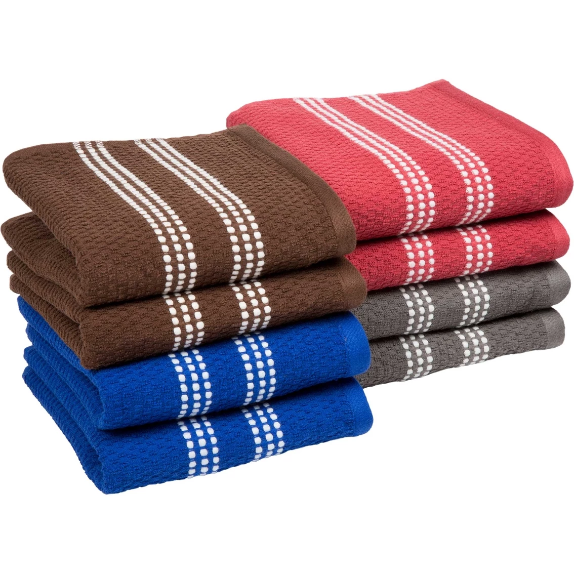 Keep your kitchen spotless and stylish with the 100% Egyptian Cotton Popcorn Terry Kitchen Towel Set from Lavish Home. These truly absorbent towels are attractive and practical to hang out to dry in plain sight. Woven from 100% Egyptian cotton loops with a popcorn weave in rich royal blue, rustic red, earthy brown and warm gray, each featuring white spotted stripes.