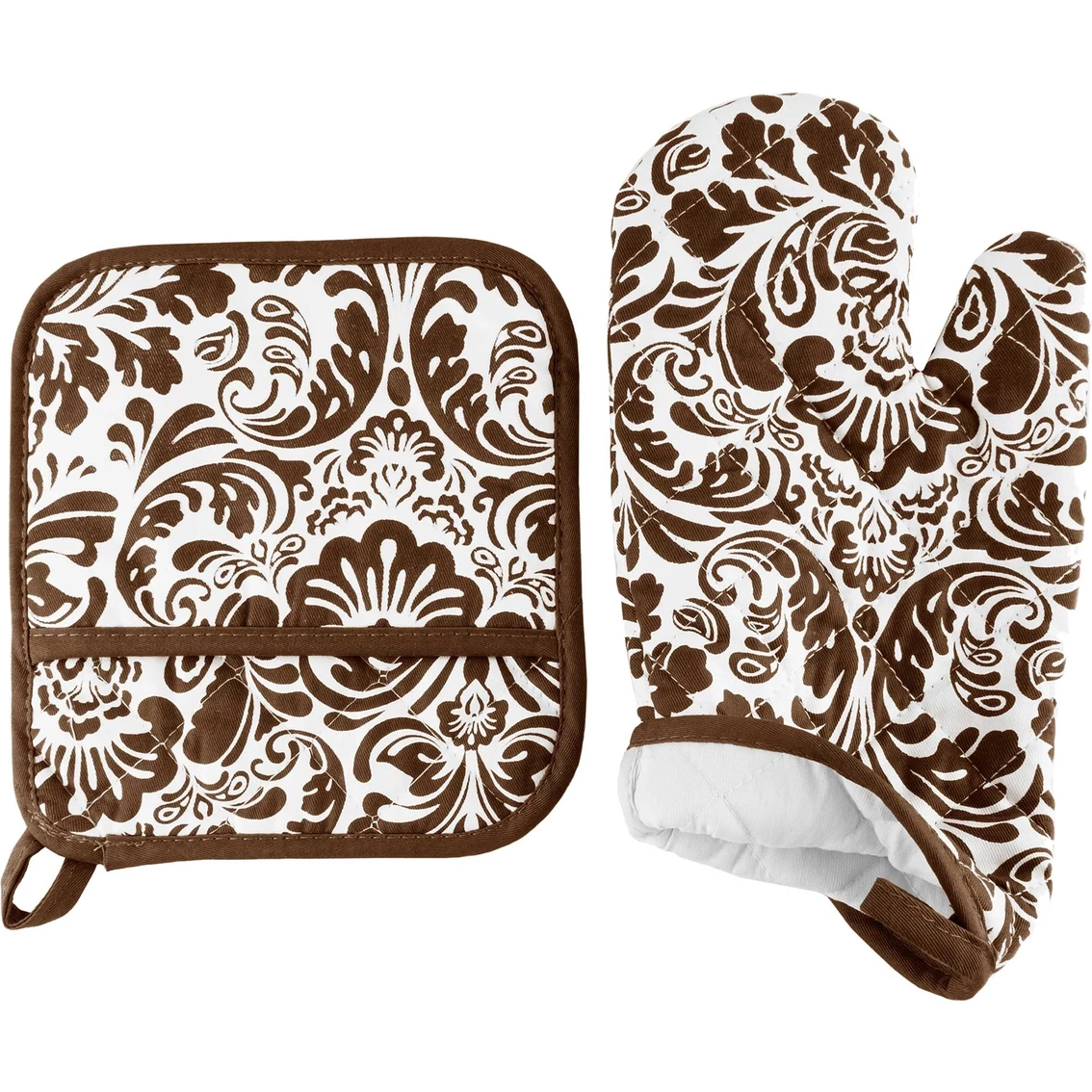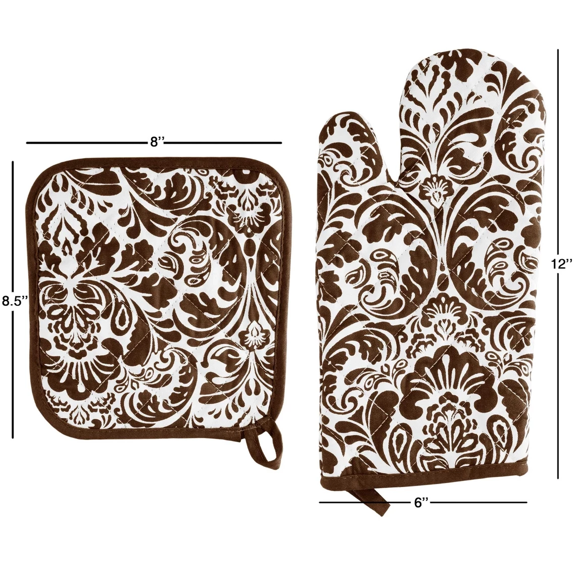 Product Specifications: Set of Kitchen Mitt and Pot Holder in Black and White. Paisley Pattern. Outer Material and Binding – 100% Cotton. Filling: Polyester. Dimensions: Mitt – 12 inches (Length) x 6 inches (Width), Pot Holder – 8.5 inches (Length) x 8 inches (Width). Do not use either part of the set when they are wet. Model: 69-07-C.