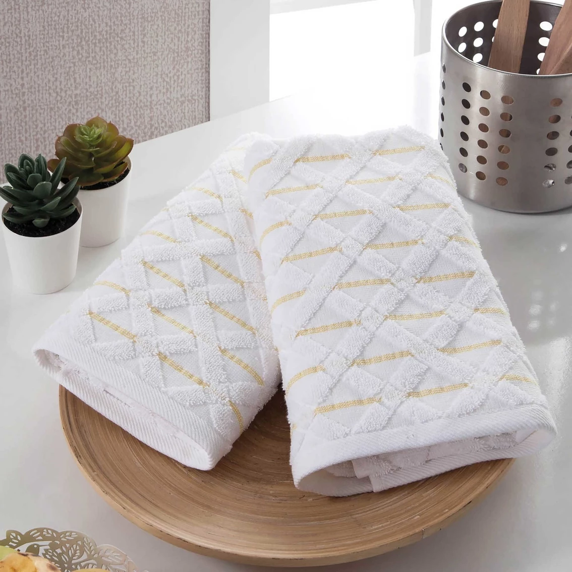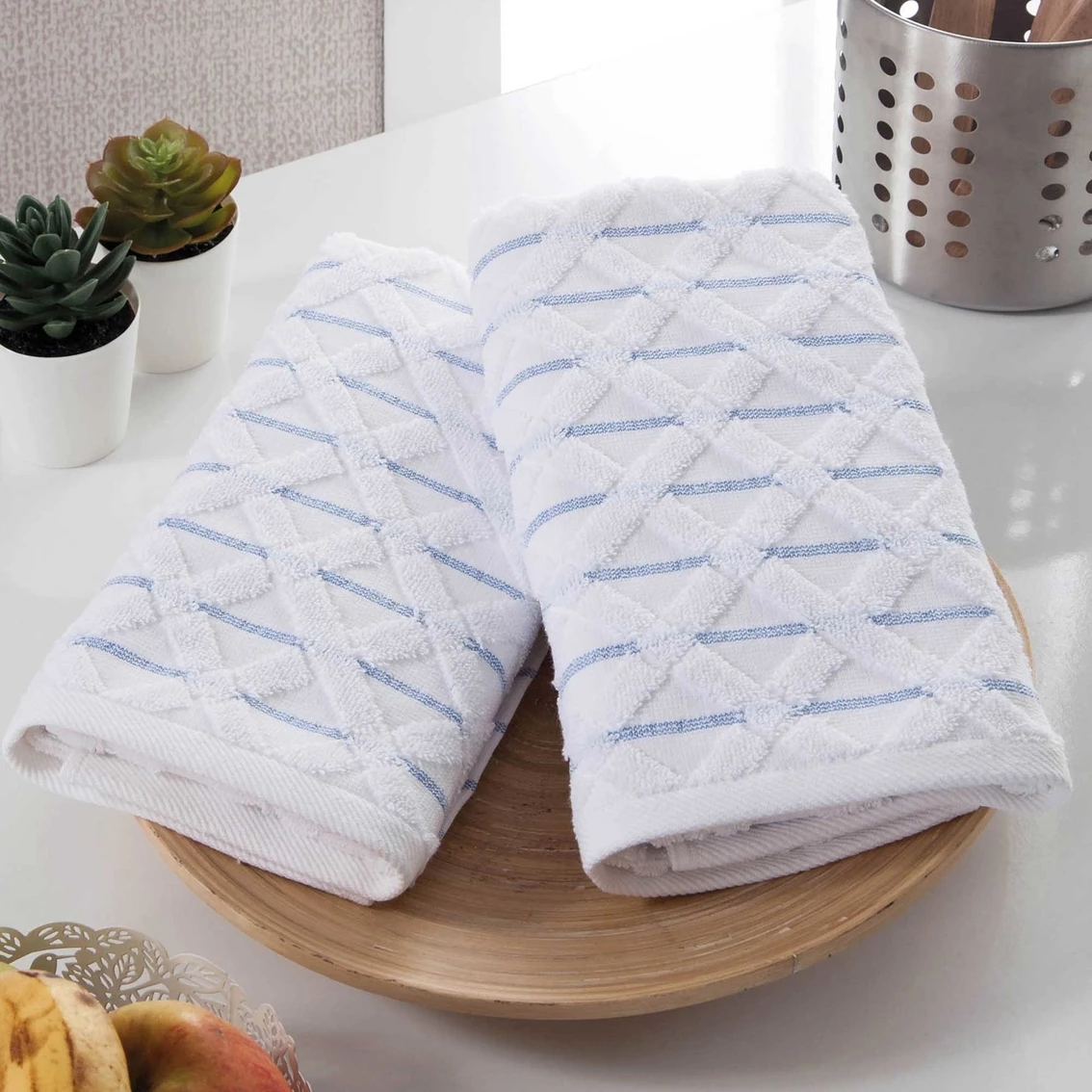 Ozan Premium Home Diamond collection 100% Turkish-cotton kitchen towels are a super absorbent, quick-drying and elegant accessory to your kitchen. With crossed design, these luxurious yet practical towels will be a pleasant part of your everyday routine. Style: OPHDI.